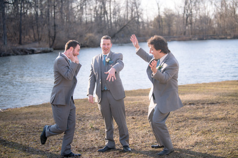 Not too far away, the groom was at his parents' home, preparing to see his bride. There were a couple of hiccups when a couple of his groomsmen were hit with the flu bug, but the family stepped up and in to be there for Brendan. While some of the guys tried to figure out how to tie their ties, others decided that tying the tie around their heads and karate-chopping was the thing to do. We loved it! Later, Brendan had his letter from Elizabeth to read and an extra surprise: A pin that had pictures of both of his grandfathers who were there in spirit and something he could wear over his heart.