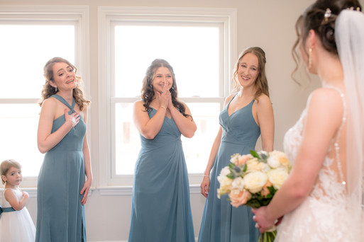 The bride got ready at her and her husband's new home. Her bridesmaids, Mom, and Mother-in-law were there. Elizabeth's gown was gorgeous and delicate as her Mom, Georgia, lovingly helped her daughter dress for the day. The bridesmaids waited excitedly to see Elizabeth in her gown for the first time, fully done up for her day, and they were blown away. Shortly after, Elizabeth took a private moment to read the letter Brendan had written to her before she walked down the aisle to say "I do".
